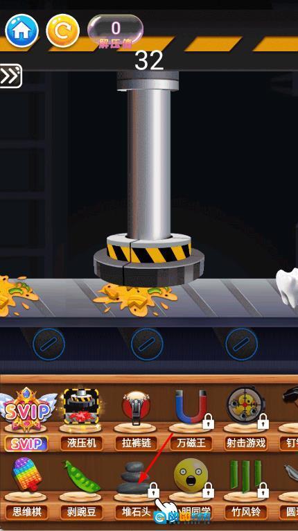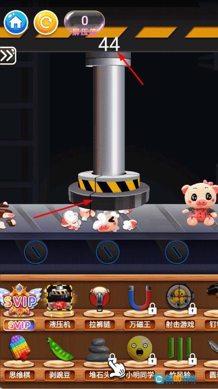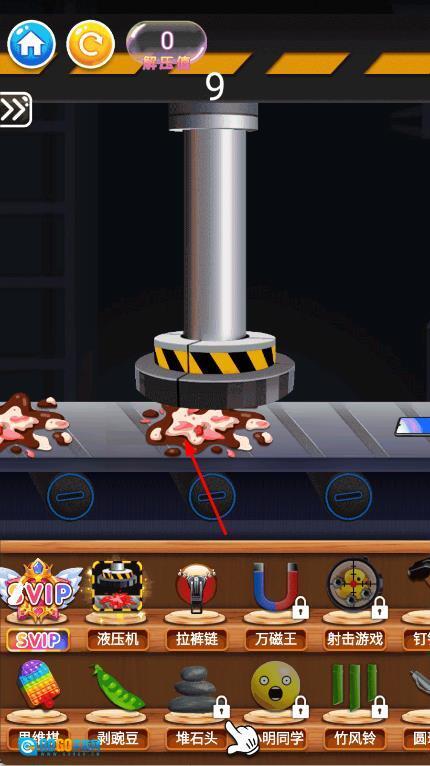 进入游戏后,挑选牙齿、草莓这类物品放置在液压机下方,接着点击液压机来启动挤压操作。