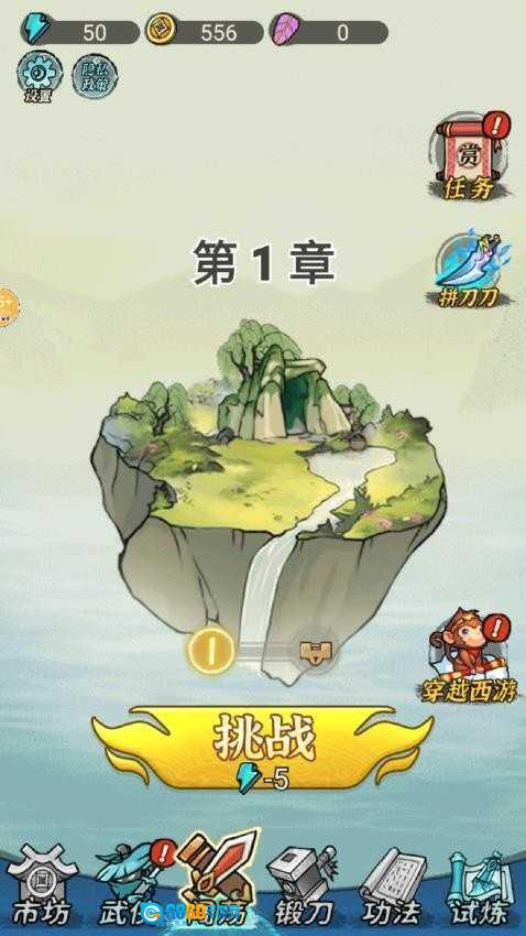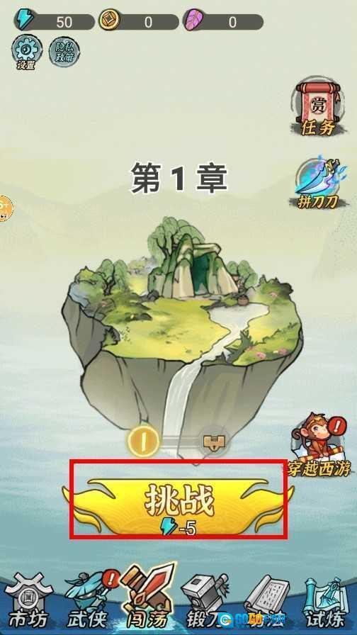 点击挑战按钮,消耗5点体力开启第1章的冒险,进入充满武侠元素的场景,开启江湖闯荡之旅。