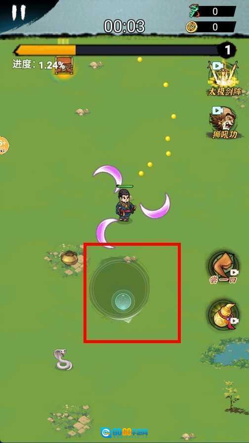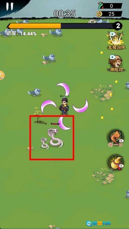 当遭遇蛇之类的怪物时,运用角色的攻击技能向其发起攻击,成功击败怪物后能够获取金币等奖励,从而提升自身实力。