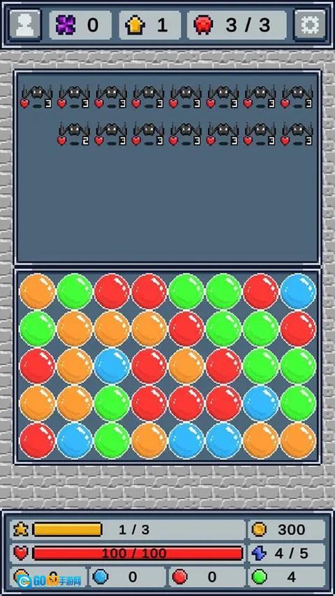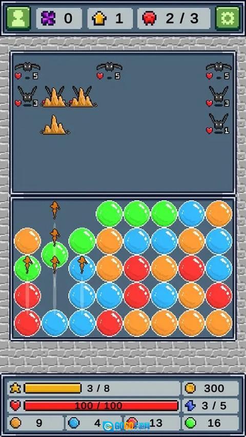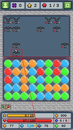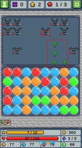 玩家在消除操作时要留意体力的消耗情况,一旦怪物越过特定的线就会对我方发起攻击,导致血量减少,若血量完全耗尽则挑战失败,必须重新开始游戏。