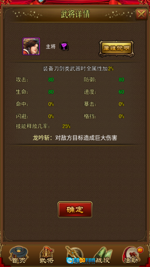 江东霸主自带25%的格挡属性;其“振奋意志”特性可在格挡成功后,让自身恢复部分生命值,同时使发动攻击的对手命中率下降。