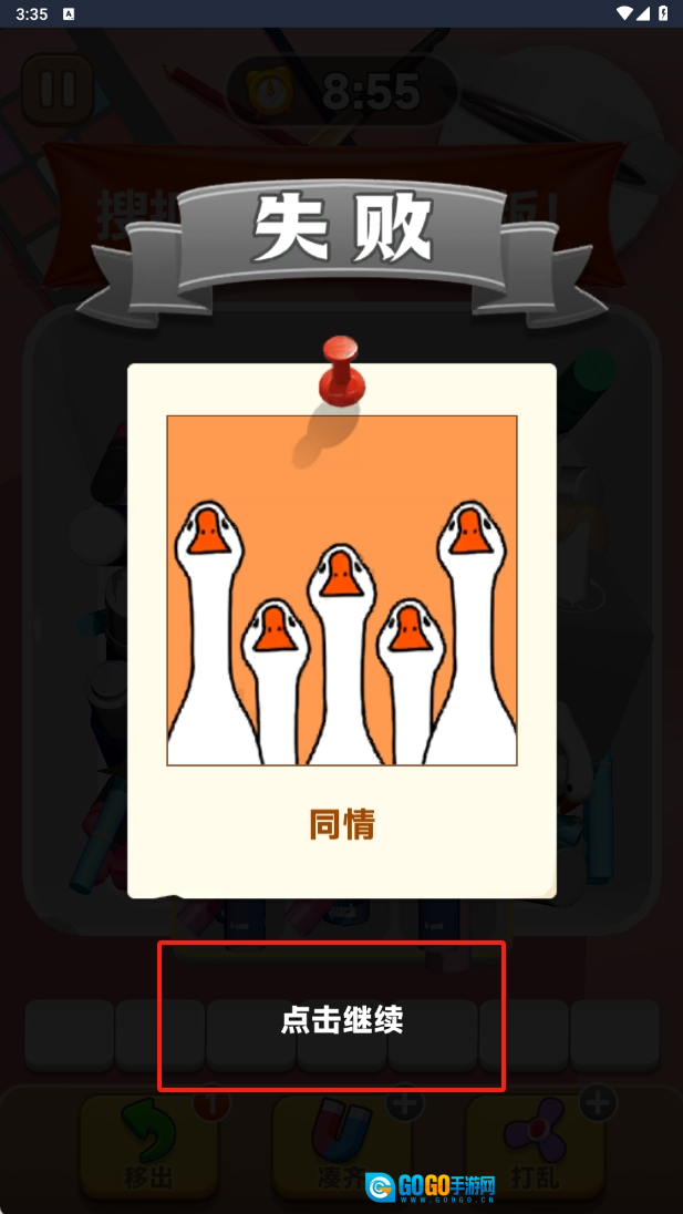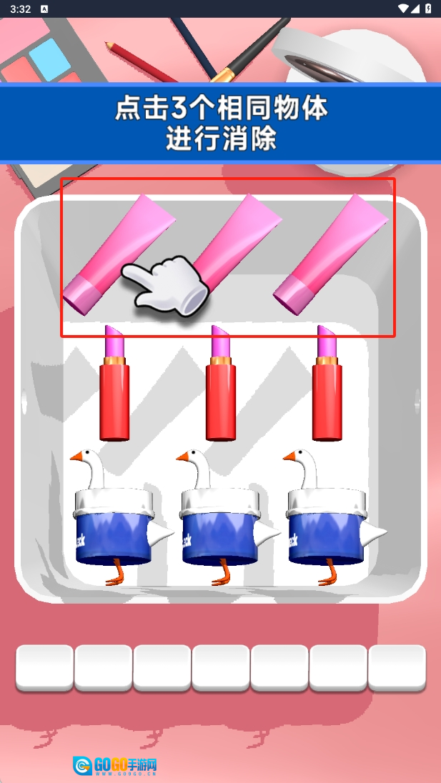 进入第一关,这一关难度较低,只要点击3个相同的物品来消除,就能顺利通关。