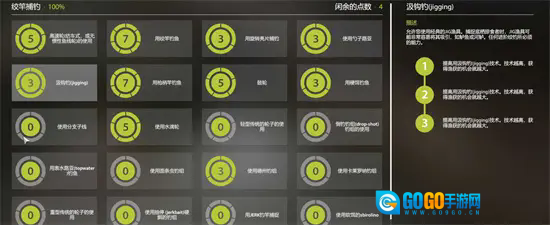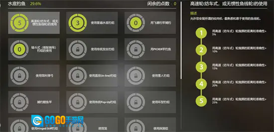 这些加满后就可以考虑加绞杆的技能点了,在中期喜欢拖钓或者玩路亚的一定要点,7点用于绞杆钓鱼,3点用于旋转亮片钓,3点用于勺子路亚钓,3点用于汲钩钓。