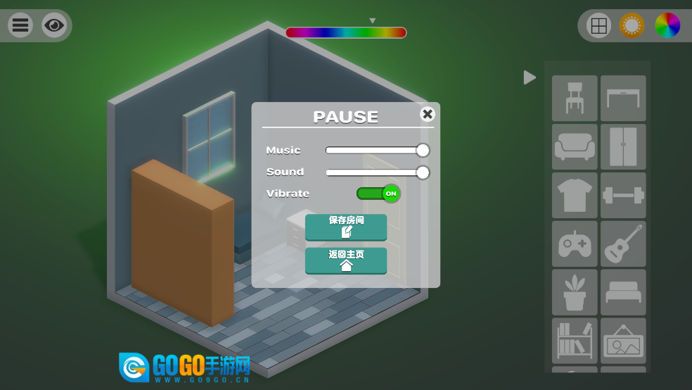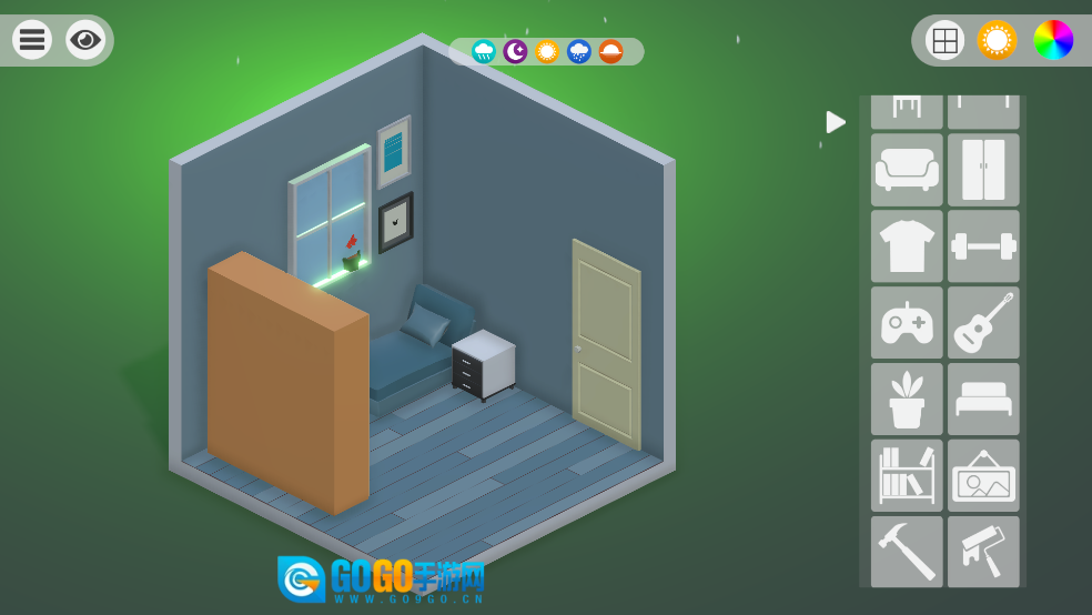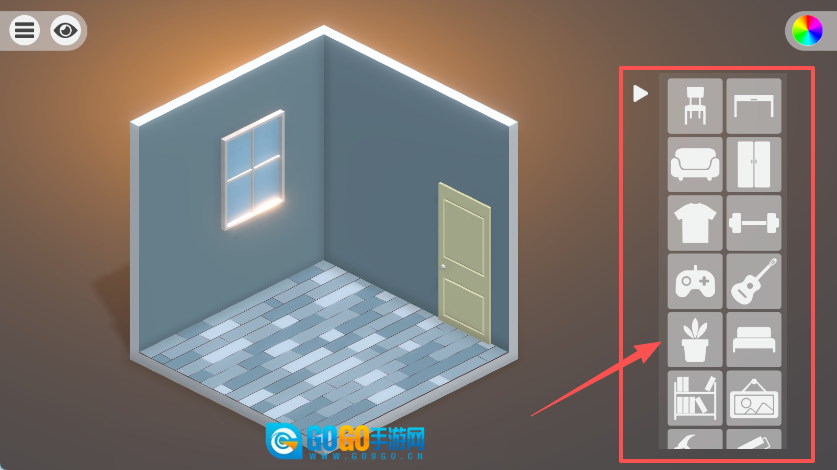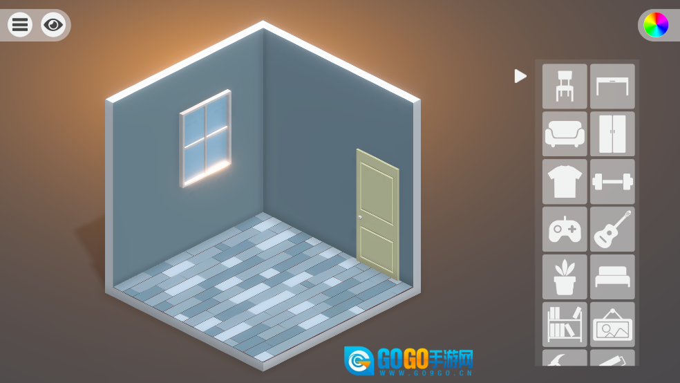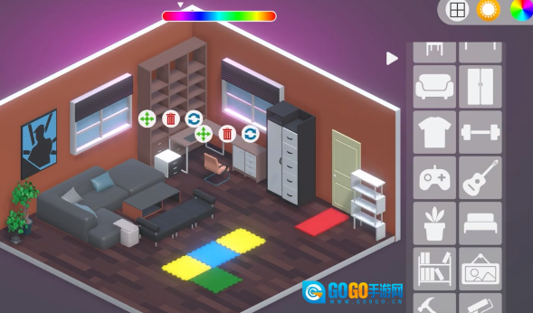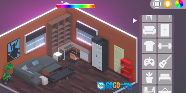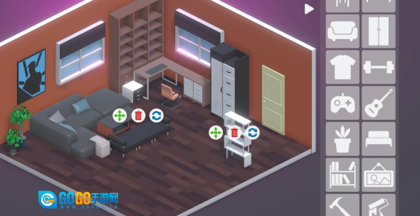 房间布置的界面里,蓝灰色的立方体房间左侧设有发光的窗户,右侧的物品选择栏中整齐排列着沙发、衣柜等各类家具图标,只需从中挑选自己想要的家具即可。