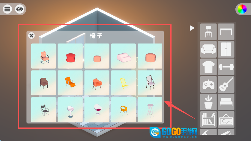 在家具选择界面里,上方呈房子形状的区域中,既有“椅子”的文字标识,也有多排椅子的图标;右侧竖排排列着各类家具图标;此外还能看到位于左上角的按钮。