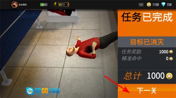 任务完成后点击下一关按钮即可进入新的狙击任务,这是持续推进游戏进程的关键操作,需要适应新的场景类型。