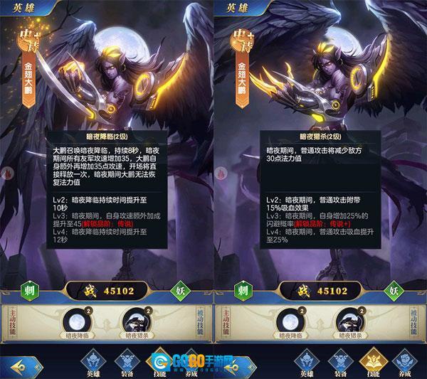 战斗开始后,金翅大鹏就会释放“黑暗降临”技能,夜幕笼罩时所有友方单位的攻击速度都会逐步提升;而且随着金翅大鹏等阶的提高,它在暗夜阶段还会解锁削减敌方法力值、吸血等效果,这机制实在是有些无赖!