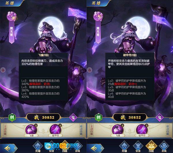 今天要介绍的第五位英雄,是鬼族里的小可爱“黑无常”。这位手持镰刀的小萝莉,自身物理伤害相当出色,还能为队友附加破甲效果。战斗开始时,她会给攻击力最高的友军挂上破甲符,被带有破甲符的英雄攻击到的敌人,护甲值会下降,所以也建议搭配红孩儿这类高攻击力英雄一起出战哦!