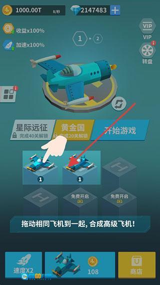 拖动相同类型的飞机(例如2架蓝色战机),将它们合成更高级别的机型,以此提升收益和战力,解锁新的飞机库,推动合成进度向前发展。