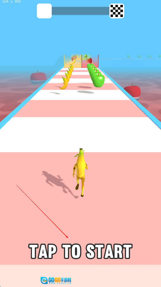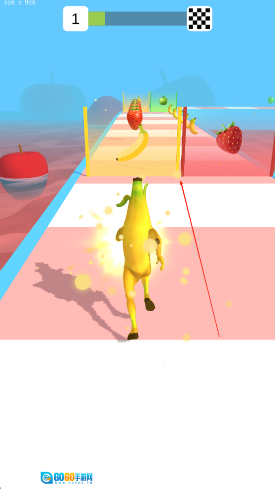 在跑道上拾取四处散落的苹果、香蕉之类的水果,每攒够10个水果,巨人体型就会提升1级,同时解锁“水果弹幕”技能,轻触屏幕即可发射水果攻击前方的障碍物。