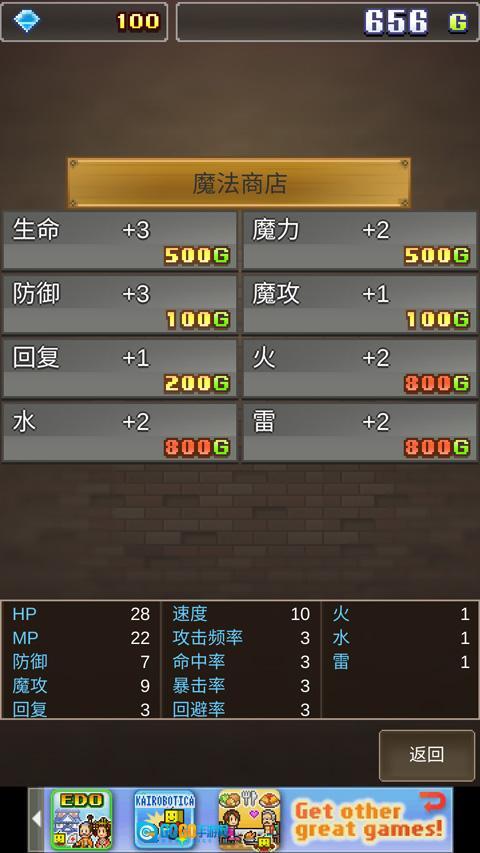 之后会开设魔法商店,把火与水的等级各提升一级,余下的钱可以用来升级回复能力和防御能力。