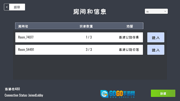 连接在线模式后,能看到当前在线的房间、人数、地图等信息,点击即可进入他人房间,之后再点击右下角的【创建】按钮。