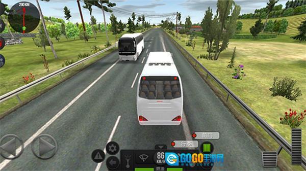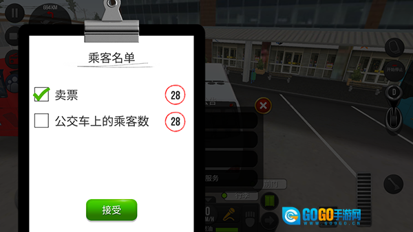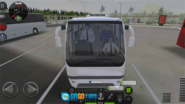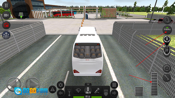 进入游戏后,我们要驾驶公交车,需点击图中所示的启动停止键、换挡杆和加速按钮来发动公交车。