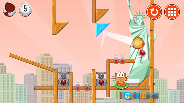 让汉堡滚落在猫咪的身边,猫咪就可以吃到汉堡啦。