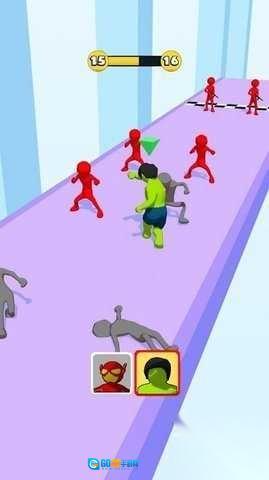 在跑道上遇到绿巨人这类敌人时,切换下方的红、绿角色,操控他们进行战斗,躲避伤害,朝着终点推进。