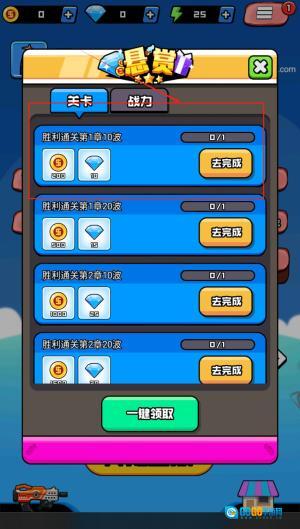 在悬赏任务界面查看关卡挑战,完成指定章节的对应波次就能拿到金币和钻石奖励,还能一键领取所有已完成任务的奖励。