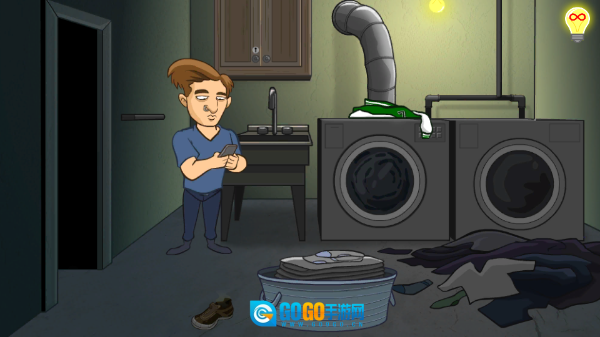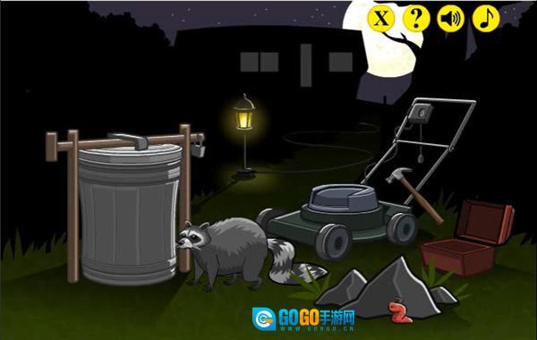 首先点击路灯的电线,接着点击除草机,让路灯电线连接到除草机上;随后按下除草机开关吓退浣熊,再依次点击红色工具箱和锤子,用锤子敲打垃圾桶左上角的棍子,之后点击木棍使其掉落,再点击垃圾桶盖,然后点击垃圾桶倒出的垃圾;最后先躲进垃圾里,再按除草机开关,等浣熊回来后点击它(若不先藏进垃圾就关除草机,会触发好结局)。