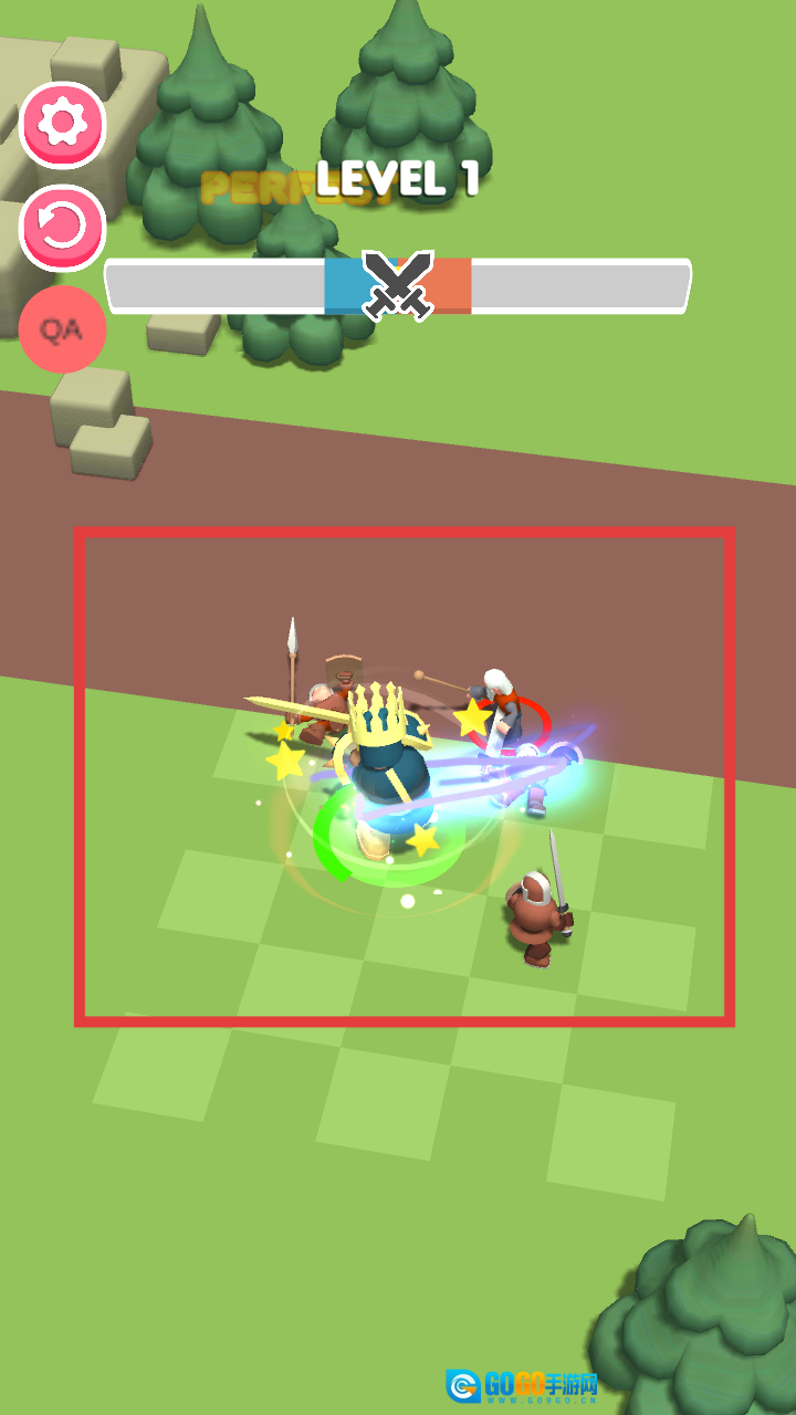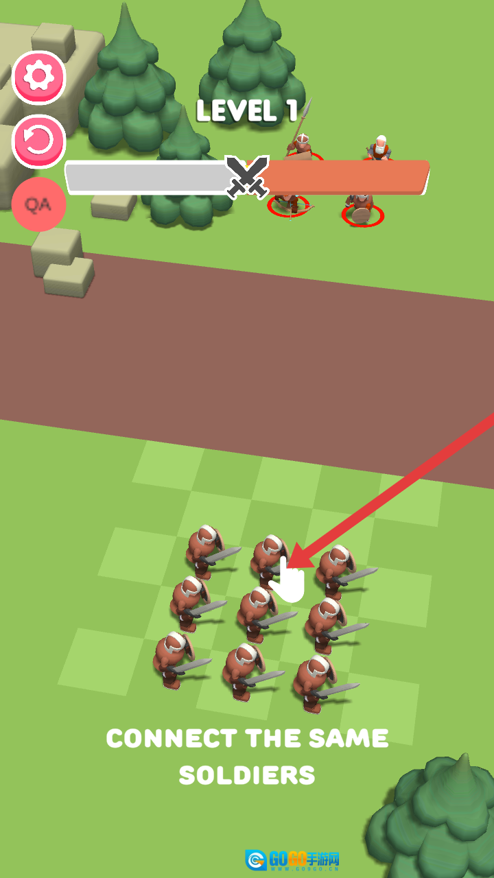 进入LEVEL-1关卡后,按照屏幕提示“CONNECT THE SAME SOLDIERS”的指引,把相同的士兵连接起来进行合成,以此提升队伍的战斗能力,为接下来迎击上方出现的敌人做好准备。