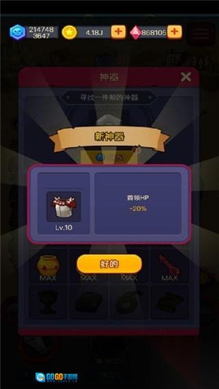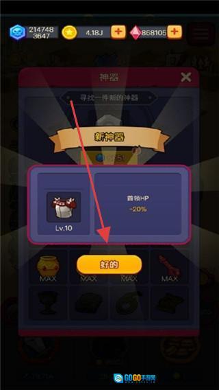在神器获取界面中,你可以解锁全新的神器(例如Lv.10的神器能让首领HP降低20%),点击“新的”按钮即可装备该神器,从而提升你的战斗能力。