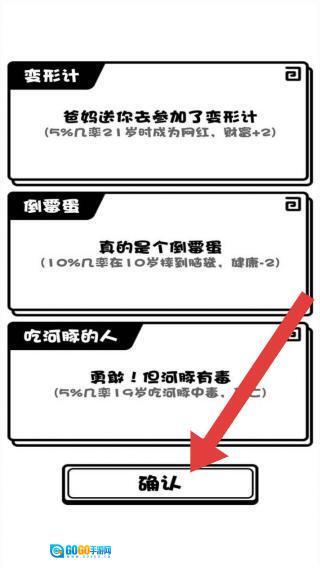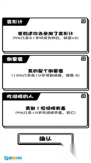 玩家能够通过点击“确认”来选定事件,这些事件会对角色之后的人生走向产生影响(比如成为网红、健康状况发生改变等),这是具有特色的随机人生事件部分。