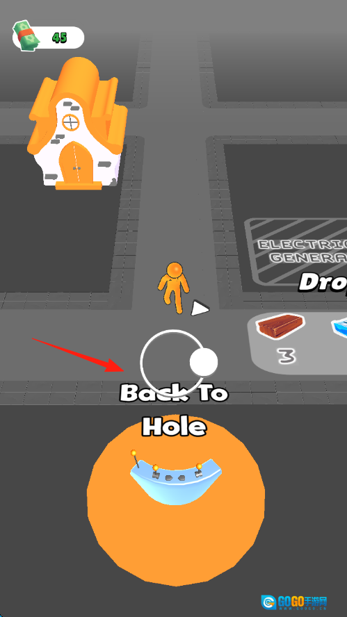 点击“BackToHole”,进入废品场后,操控角色靠近垃圾,触发吸附功能,收集基础废品。