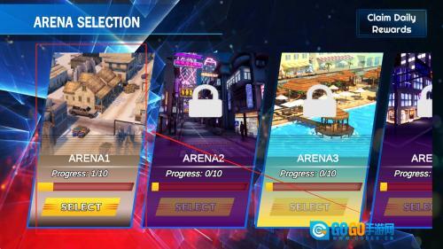 在关卡选择界面浏览不同难度的竞技场,了解每个区域的特色挑战内容。