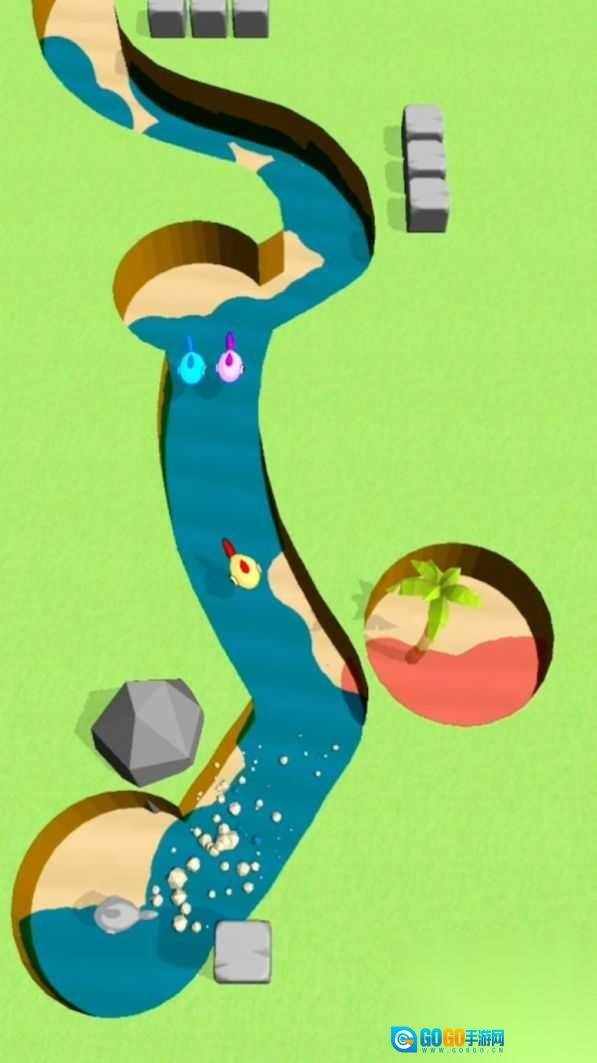 关卡挑战机制:采用关卡递进式的难度设计,从初始的单一河道场景逐步过渡到多分支交织的复杂地形,每一关都配备了别具一格的障碍组合,像移动的巨石、分叉的水源等元素,以此不断点燃玩家的探索热情。