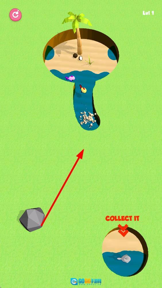 只要让所有鱼儿都能在小渠里存活就能通关,随着关卡不断推进,河道里的障碍会越来越多,这就需要我们更巧妙地规划挖河的路线。
