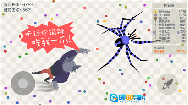 《五毒大作战》手机版打破了传统贪吃蛇的玩法框架,在多人同屏对战时,玩家不必担心自己的蛇身长度带来的限制,反而要时刻提防其他对手的包围夹击。通过吞食场景中的光点来增加自身的体型,灵活运用走位技巧引诱敌人撞到你的蛇躯上,这样就能把对方转化为自己成长的能量。当能量积累到一定程度后,还能变身为蜘蛛喷射出束缚敌人的毒网,或是切换成蛤蟆形态进行跳跃式的突袭。在多种毒物形态的切换过程中,玩家可以体验到类似大逃杀模式下的生存策略对抗乐趣。