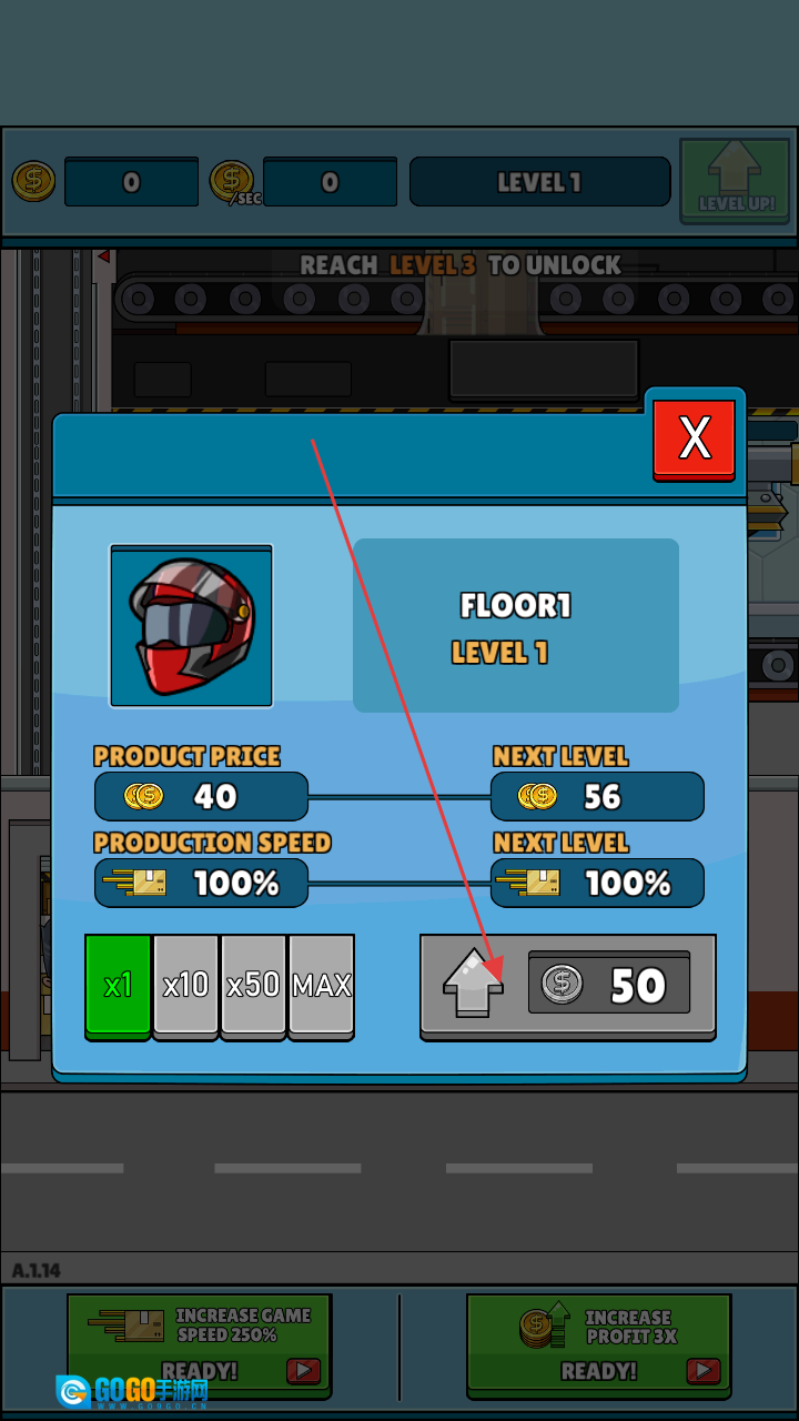 在物品升级的界面里,花费一定数量的金币(例如50枚),可以用来提高产品的定价、加快生产的速度,从而让工厂获得更多的收益。