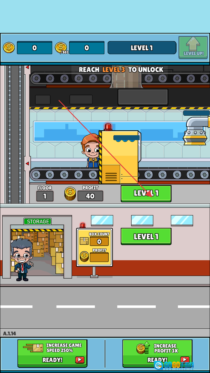 进入工厂场景,查看传送带的生产流程,然后点击“LEVEL1”来提升楼层的生产等级。