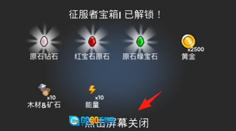 完成奖励获取可解锁“征服者宝箱”,开启后能得到原石钻石、黄金等资源,点击关闭弹窗即可继续游戏。