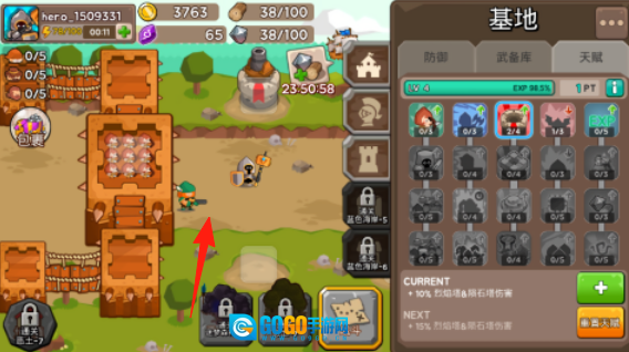 在基地场景中,可开展如下操作:布置防御类建筑以强化基地防护,对武备库与天赋系统进行升级提升战力,同时派遣猎人、战士等英雄角色参与关卡守卫作战。