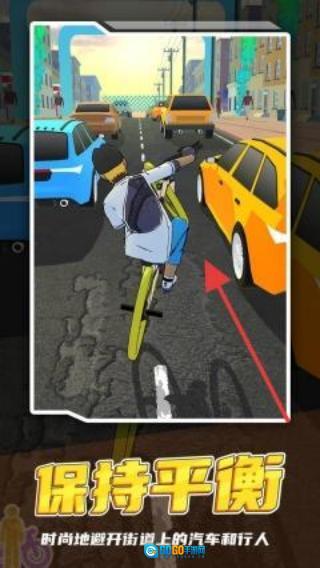 遇到汽车和行人时,稍作调整方向、稳住重心以保持平衡,灵活地穿梭其间,注意不要发生碰撞,同时维持好骑行的节奏。