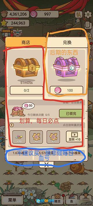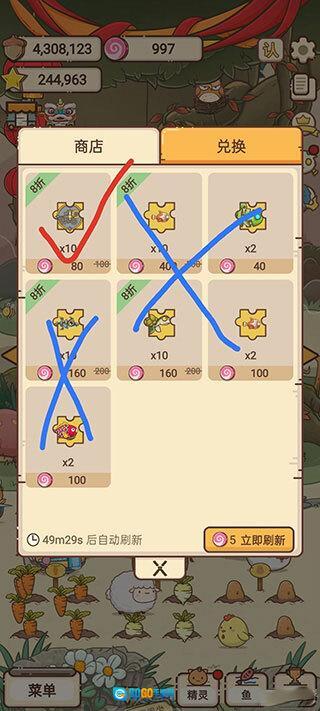 考虑到商店里那些限量供应的鱼类无法为我们带来额外收益,所以建议商店优先考虑购买建筑以及藏品碎片,因为这些物品能带来加成效果。