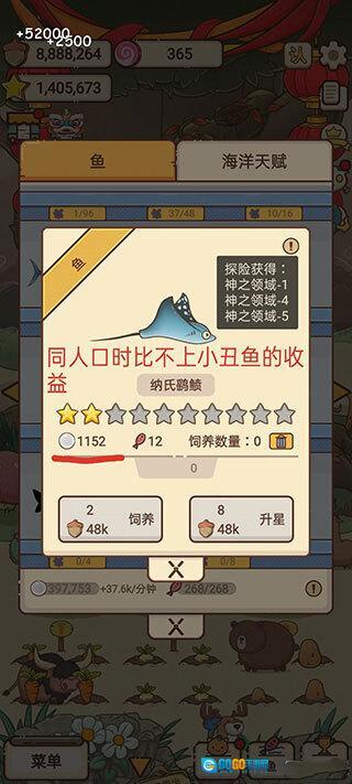 鱼的产量只和品质与星数挂钩,只和品质与星数挂钩,只和品质与星数挂钩!用基础的小学数学算一算就能发现:A鱼是金色3星,占2人口,产量400;B鱼同样是金色3星,占10人口,产量2000。这意味着在人口相同的情况下,就算是第一关掉落的鱼,产量也不会比神之领域掉的鱼低!二者唯一的差别,就是后面关卡的鱼占用的人口更多了。所以千万别觉得越往后的关卡掉的鱼产量就越高——鱼的产量只取决于它的品质和星数。再加上这游戏里鱼的人口非常紧缺,搞懂这一点可是相当关键的。