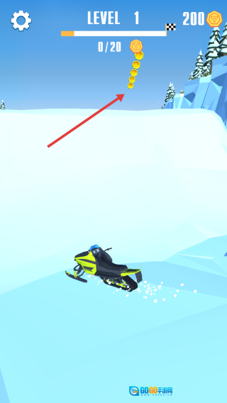 在Level1关卡点击【TAP TO START】,驾驶雪地摩托开始行程,使用“FLIP BOOST”(消耗50金币)进行加速。