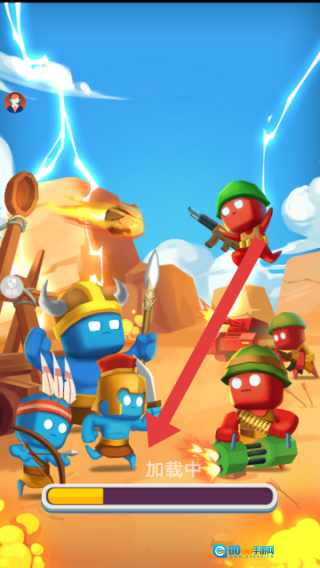 等待“加载中”进度条走完(箭头所指位置),进入游戏主场景后,操控彩色战士角色,为即将开始的对战做好准备。