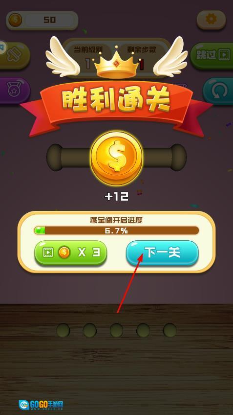 成功解开所有绳索后,屏幕会显示胜利通关的提示,同时获得金币奖励。此时点击下一关,就能挑战难度更高的绳结了。