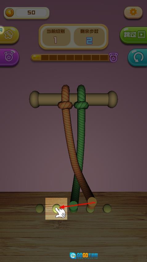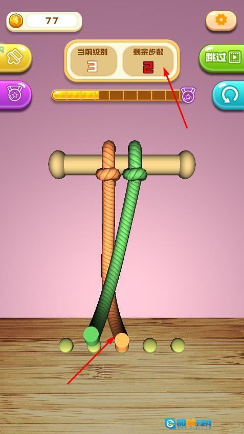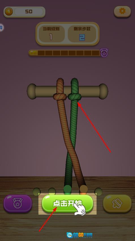 点击开始,留意交叉的绳索和底部的卡扣,规划好移动的步骤,还剩2步。