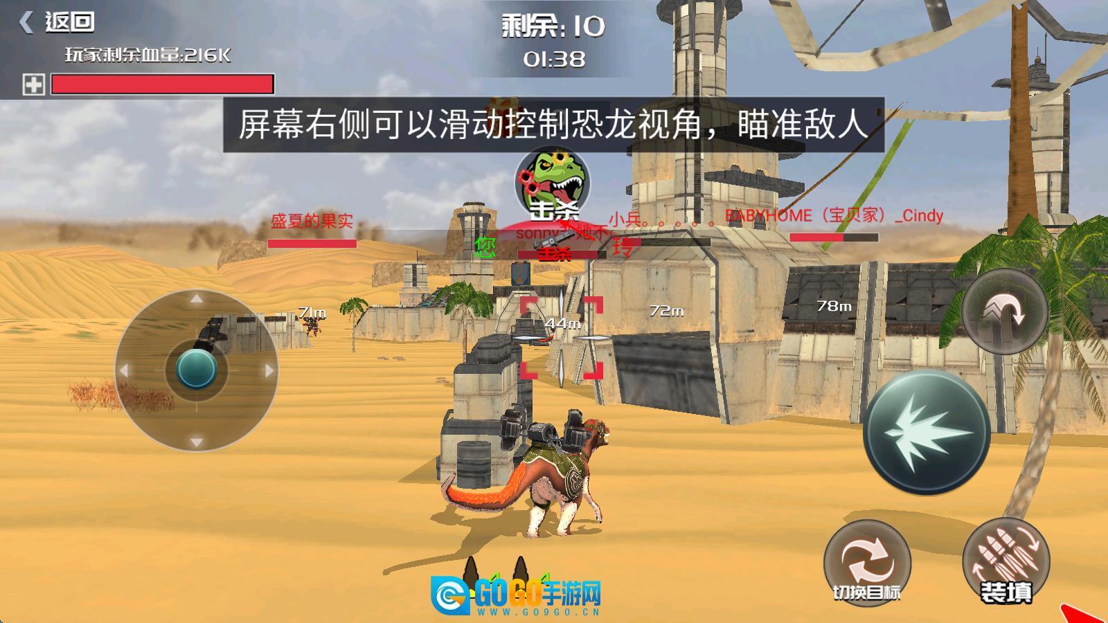 打开游戏后,在首页挑选你喜欢的模式并点击对战按钮;接着选定要出战的恐龙,就能进入战场了。进入战场后,你可以通过左下方的轮盘来控制移动方向,向右滑动屏幕则能调整视角,这样就可以开启你的战斗之旅啦。