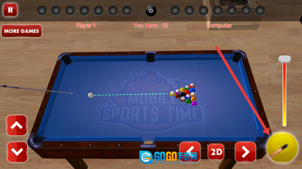 进入游戏后,调整球杆的摆放位置和力度条的数值,对准球堆,点击击球按钮即可开启8球对战流程。