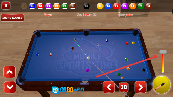 击球时,再次确认力度与瞄准方向,击打母球,通过活动滚动条控制力量,遵循8球规则击打目标球,力求获胜。