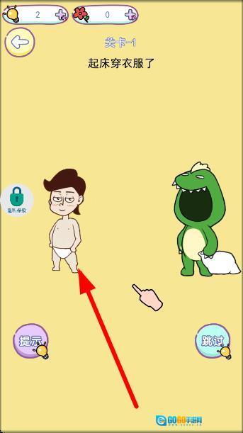 观察裸体角色,找出隐藏的衣物,通过拖动操作帮角色穿上衣服,要留意恐龙的干扰,完成穿衣任务后,若有需要可点击提示获取帮助。