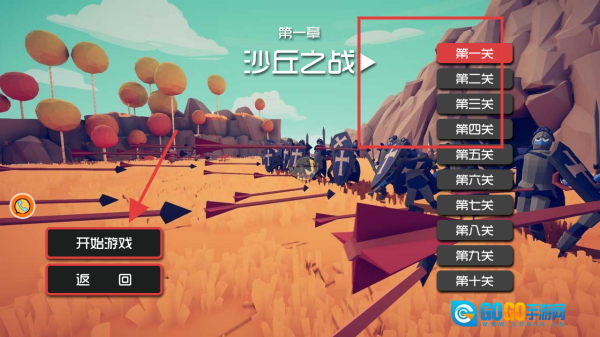 在游戏的关卡选择界面,设有多个关卡选项,点击“开始游戏”按钮,就能进入游戏,开启你的战斗冒险旅程。