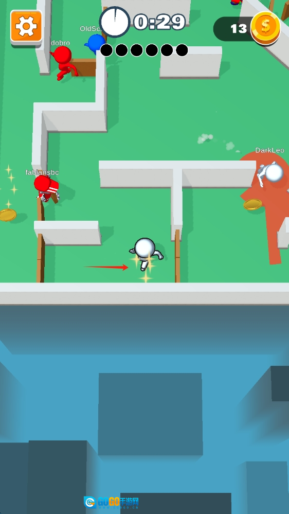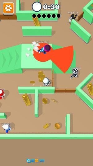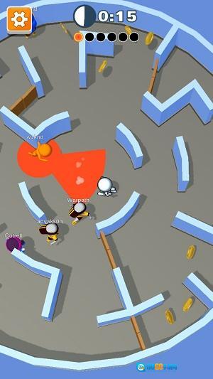 进入HIDE模式的操作界面后,借助虚拟方向键操控白色小人在迷宫里移动,要时刻留意剩余时间与金币数量,灵活避开红色小人的追捕。