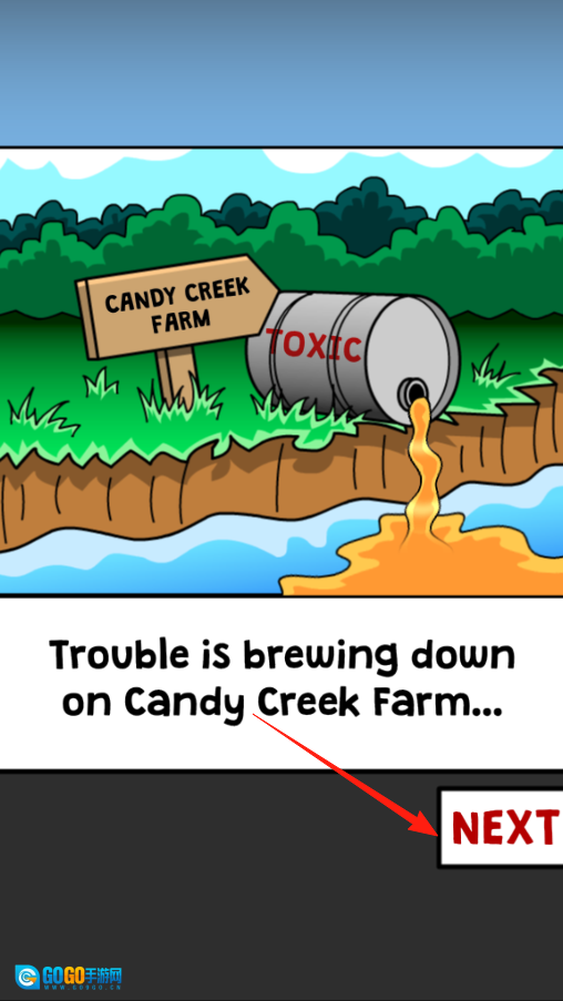 出现农场危机漫画,有毒桶污染河流,还有文字Trouble is brewing,点右下角NEXT继续看后续剧情,了解农场遇到啥麻烦,为玩游戏做铺垫。