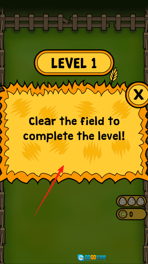 进入第一关后,界面会提示“Clear the field to complete the level”,需要想办法清理这片田地——可以利用弹球或其他道具来击碎砖块等障碍物,把田地彻底清理干净就能顺利通关。