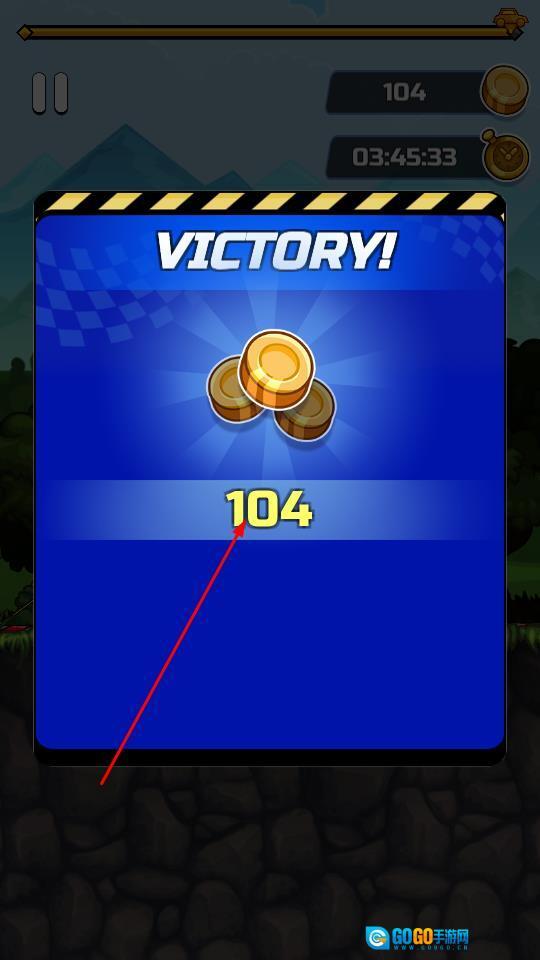 当顺利完成赛道的全部赛程后,界面会弹出“VICTORY!”的胜利提示,同时显示本次挑战获得的金币数量(例如示例中的104枚),意味着成功达成关卡目标并获得相应奖励。