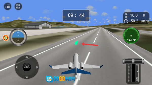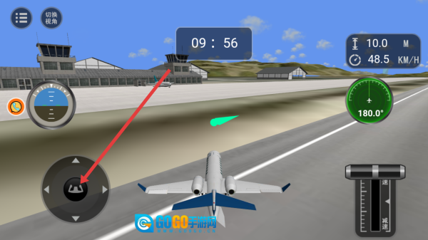 游戏开始时,先让飞机进入滑行状态,通过左下角的方向摇杆来操控飞机转向,按照跑道上的绿色指引标记调整飞行方向,确保飞机保持直线滑行。